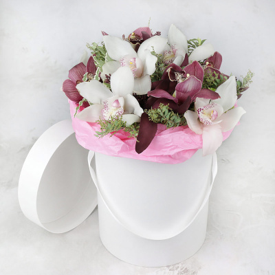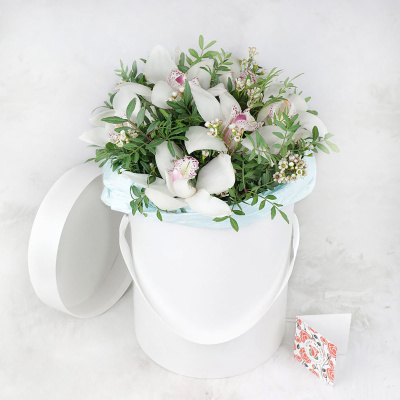 Композиция из орхидеи и хамелациума в шляпной коробке| 9 400 Р | без скидки |