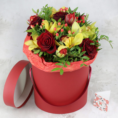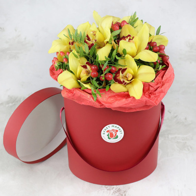 Композиция из орхидеи и гиперикума в шляпной коробке| 9 600 Р | без скидки |