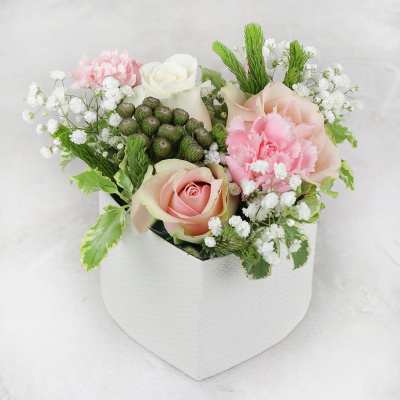 Композиция из белых роз и гвоздик в шляпной коробке| 7 600 Р | без скидки |