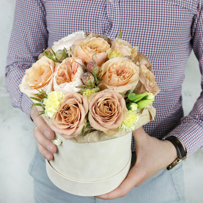 Композиция из пионовидных роз в шляпной коробке| 10 300 Р | без скидки |