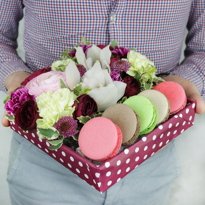 Коробка с макарунами. Орхидея, розы и гвоздика| 5 400 Р | без скидки |