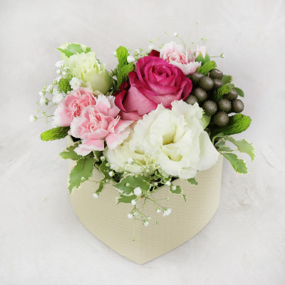 Композиция из роз, гвоздики и брунии в коробочке| 4 500 Р | без скидки |