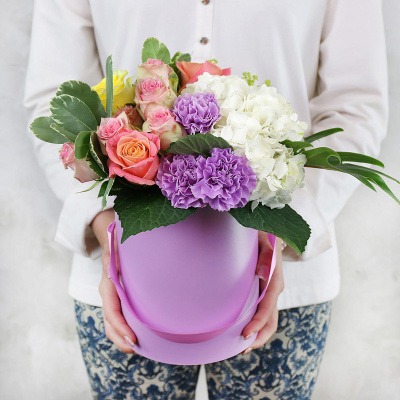 Композиция из гортензий, гвоздик и роз в шляпной коробке| 6 300 Р | без скидки |