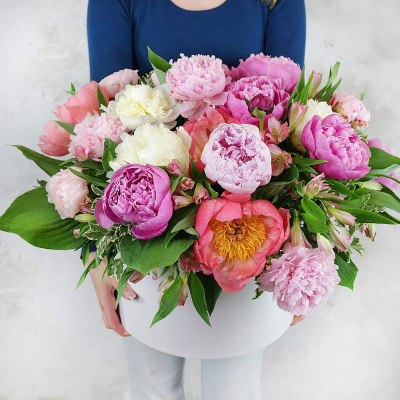 Композиция из пионов, альстромерий и листьев питтоспорума в шляпной коробке| 49 000 Р | без скидки |