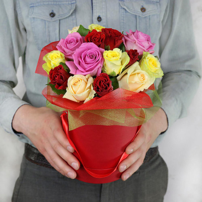Композиция из 15 разноцветных роз в шляпной коробке, Россия| 4 700 Р | без скидки |