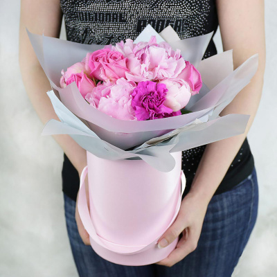 Композиция из розовых пионов и гвоздик в шляпной коробке| 14 900 Р | без скидки |