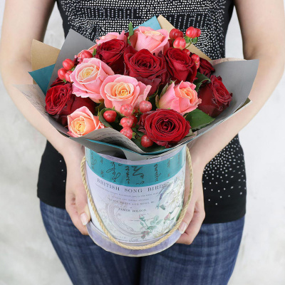 Композиция из красных и розовых роз с гиперикумом в шляпной коробке| 6 300 Р | без скидки |