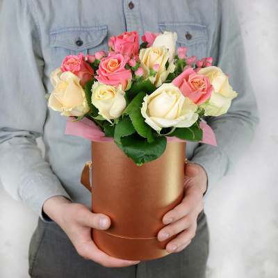 Композиция из кустовых роз и ирисов в шляпной коробке| 4 900 Р | без скидки |