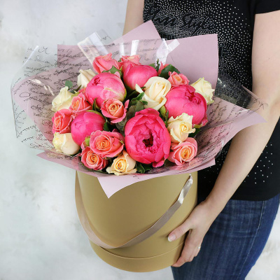 Композиция из коралловых пионов и роз в шляпной коробке| 10 800 Р | без скидки |