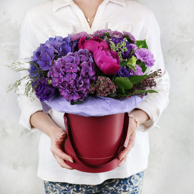 Композиция из пионов, гортензий, хризантем и лизиантусов в шляпной коробке| 8 500 Р | без скидки |
