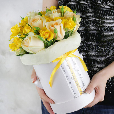 Композиция из желтых кустовых роз в шляпной коробке| 5 000 Р | без скидки |