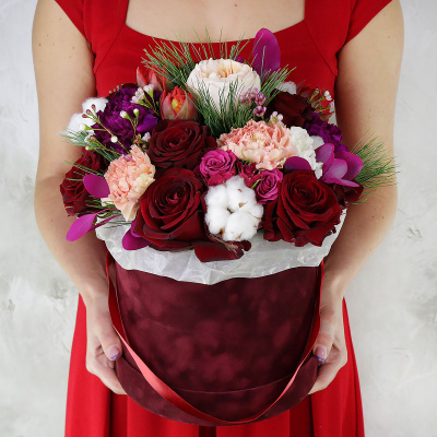 Композиция Козерогу из роз, гвоздик и тюльпанов в бархатной коробке| 12 000 Р | без скидки |