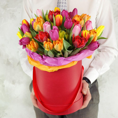 Композиция Овну из альстромерий и тюльпанов в шляпной коробке| 12 800 Р | без скидки |