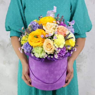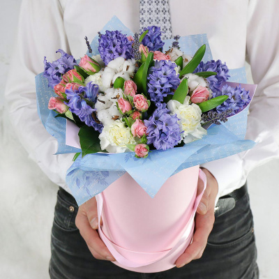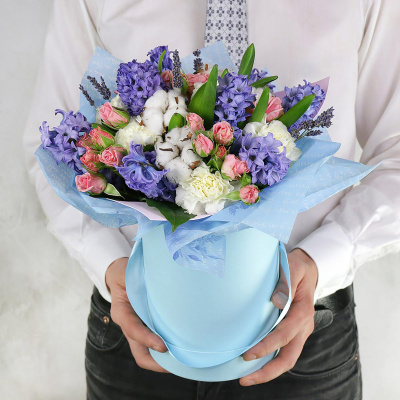 Композиция Тельцу из гиацинтов, гвоздик и роз в голубой шляпной коробке| 8 100 Р | без скидки |