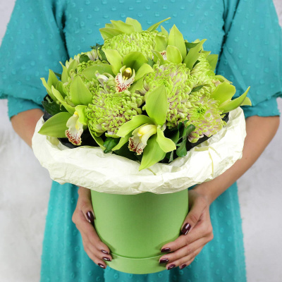 Композиция из хризантем и орхидей в шляпной коробке| 12 500 Р | без скидки |