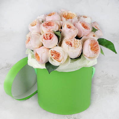 25 пионовидных персиковых роз в шляпной коробке| 17 500 Р | без скидки |
