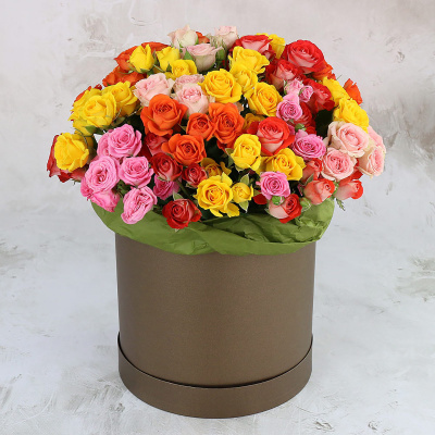 25 разноцветных кустовых роз в шляпной коробке| 10 400 Р | без скидки |