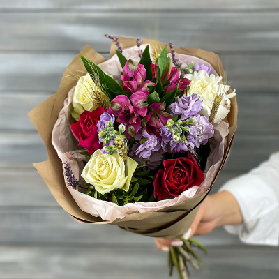 Маттиола кустовая ,Роза 40 см,Альстромерия,Гвоздика,Тритикум пшеница (Сушеный),Лаванда сушёная,Бумага упаковочная Тишью,Бумага упаковочная Крафт,Листья фисташки,Лента,Плёнка прозрачная
