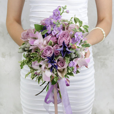 Маттиола кремовая, Альстромерия желтая, Лизиантус, Роза Гринроуз 60 см фиолетовая, Листья питтоспорума микс, Орхидея Дендробиум белая, Гвоздика кустовая белая, Лента, Плёнка прозрачная
