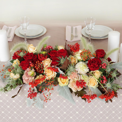 Гортензия белая, Листья питтоспорума микс, Нутан, Листья дуба (шт), Амарантус, Гвоздика лунная фиолетовая, Вибурнум ягоды (ШТ), Бовардия фиолетовая, Роза РС 50 см красная, Роза РС 40 см кремовая, Оазис кирпич, Оазис Поддон двойной для кирпича (49х12х3), Поддон для кирпича 25*13*3 см, Лента, Плёнка прозрачная