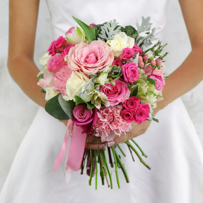Гиперикум красный, Роза Эквадор 60 см розовая, Альстромерия желтая, Гвоздика оранжевая, Роза кустовая 50 см РС белая, Роза РС 50 см красная, Роза 40 см розовая, Брассика, Листья эвкалипт микс, Сенецио Маритима, Капс, Роза 50 см розовая, Лента, Плёнка прозрачная