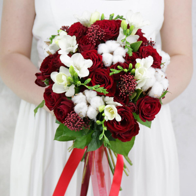 Букет невесты из роз, фрезий и хлопка| 7 900 Р | без скидки |
