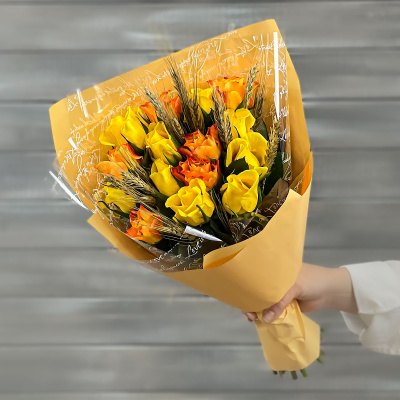 Букет из оранжевых и желтых роз с пшеницей| 2 300 Р | без скидки |