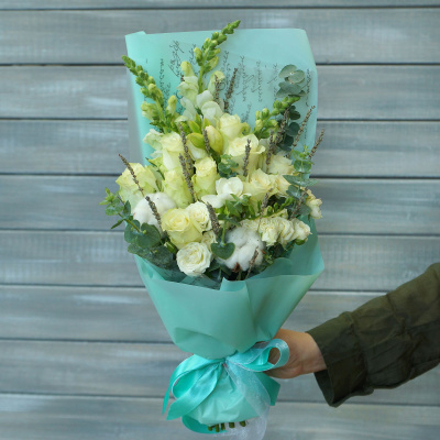 Букет из роз и фрезий с хлопком| 4 700 Р | без скидки |