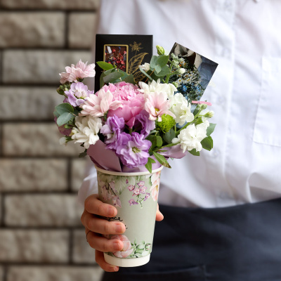 Цветочная композиция в стаканчике с шоколадом| 4 100 Р | без скидки |