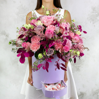 Композиция из роз, гвоздик и астильбы в шляпной коробке с Раффаэлло| 27 500 Р | без скидки |