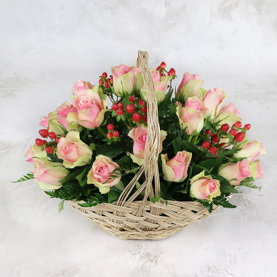Композиция из 25 зелено-розовых роз и гиперикума в корзине| 6 500 Р | без скидки |