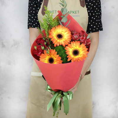 Гербера Акция,Роза кустовая 40 см красная,Солидаго микс,Альстромерия Акция,Листья эвкалипт микс,Гвоздика барбарелла грин трик,Упаковка в ассортименте,Лента,Плёнка прозрачная
