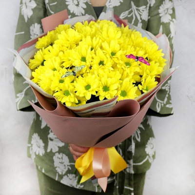 Хризантема кустовая желтая, Упаковка в ассортименте, Бабочка, Лента, Плёнка прозрачная