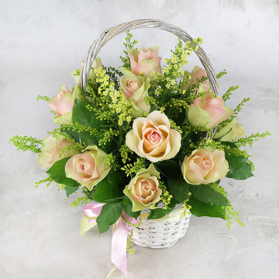 Роза Лабелла - 15 шт; Солидаго микс - 3 шт; Корзина плетеная стандарт мини - 1 шт; Оазис кирпич - 0,3 шт; Листья салал - 0,2 шт; Плёнка прозрачная - 1 шт.