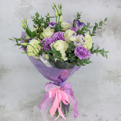 Роза Мондиаль 50 см, Лизиантус, Гвоздика лунная фиолетовая, Листья эвкалипт микс, Конус для букета, Плёнка прозрачная