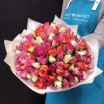 Букет из 15 разноцветных роз с лентой Кения 40 см.| 2 100 Р | без скидки |