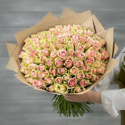 75 зелено-розовых роз в крафте Кения 40 см.| 9 200 Р | без скидки |