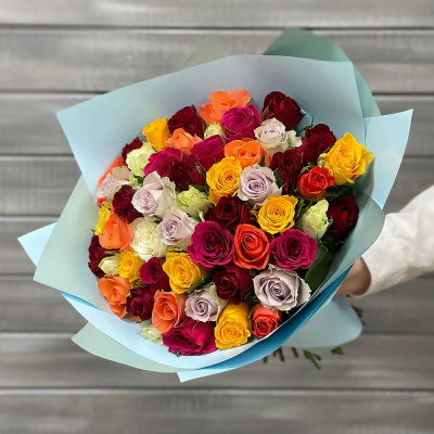 65 разноцветных роз в упаковке Кения 40 см.| 7 600 Р | без скидки |