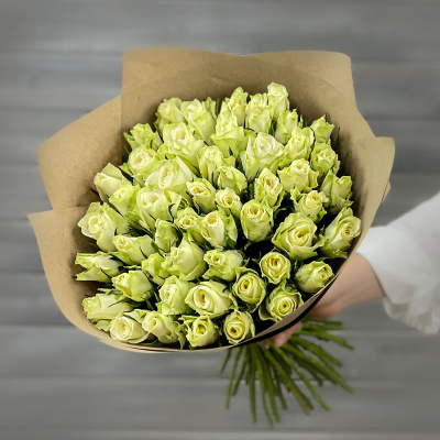 65 зелено-розовых роз в крафте Кения 40 см.| 8 100 Р | без скидки |