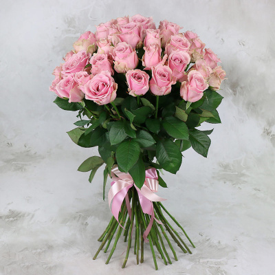 Хризантема кустовая белая ромашка - 4 шт; Роза РС 60 см Аква - 7 шт; Лимониум - 1 шт; Лизиантус фиолетовый - 2 шт; Альстромерия розовая - 2 шт; Гвоздика кустовая розовая - 4 шт; Упаковка в ассортименте - 2 шт; Лента - 1 шт; Плёнка прозрачная - 1 шт.