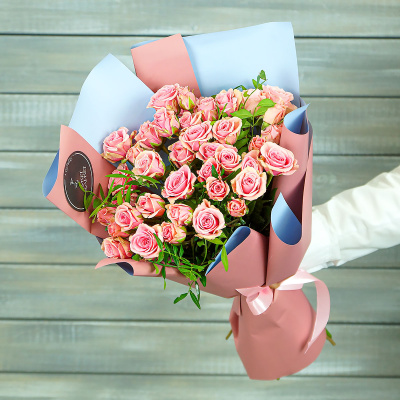 Роза кустовая 50 см,Листья фисташки,Бумага упаковочная подарочная 70см,Лента,Плёнка прозрачная