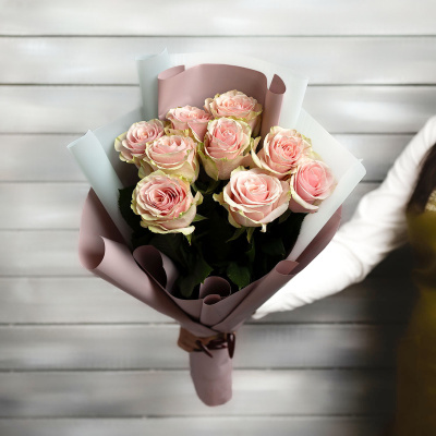 9 нежно-розовых роз в упаковке Эквадор 60 см| 4 000 Р | без скидки |