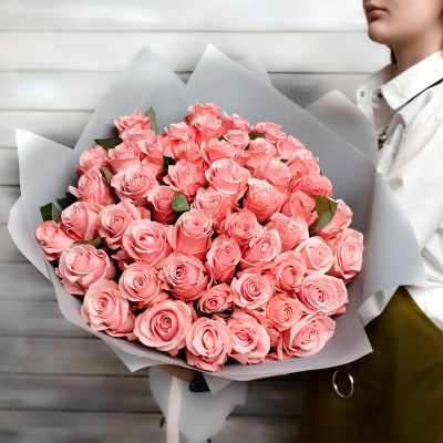 51 розовая роза в упаковке Эквадор 60 см| 15 600 Р | без скидки |