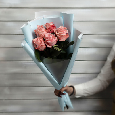 5 розовых роз в упаковке Эквадор 60 см| 2 300 Р | без скидки |