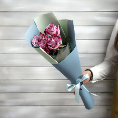 3 фиолетовые розы в упаковке Эквадор 60 см| 1 500 Р | без скидки |