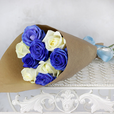 Букет из 9 роз, синих и белых в крафте| 4 500 Р | без скидки |