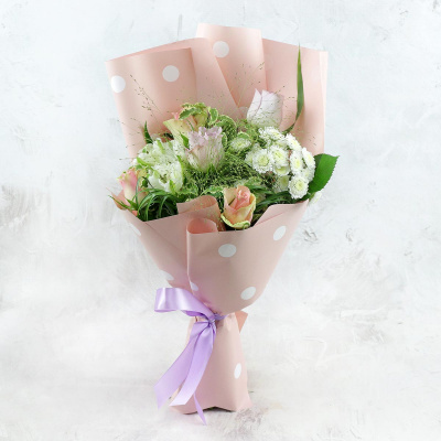 Роза Кения 40 Лабелла,Роза Оушен сонг 40 см - 50 см,Альстромерия белая,Паникум,Листья питтоспорума микс,Листья берграсс,Хризантема кустовая белая махровая,Упаковка в ассортименте,Лента,Плёнка прозрачная