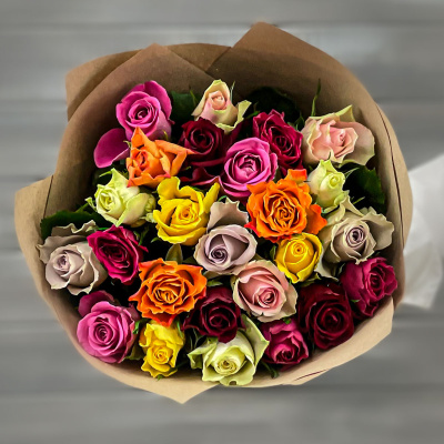 23 разноцветные розы в крафте Кения 40 см.| 3 000 Р | без скидки |
