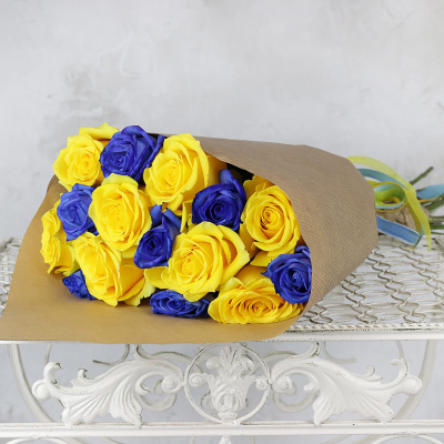 Букет из 15 роз, желтых и синих в крафте| 5 500 Р | без скидки |