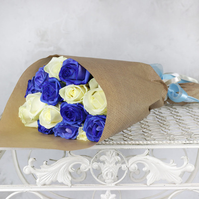 Букет из 15 роз, синих и белых в крафте| 6 100 Р | без скидки |
